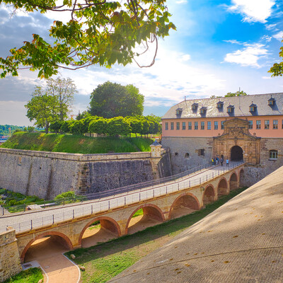 Trotz erheblicher Eingriffe in die Substanz der ehemaligen Klosterkirche St. Peter und Paul im 19. Jahrhundert zählt sie zu den bedeutendsten romanischen Kirchenbauten Thüringens. Als geistiger Mittelpunkt des Petersklosters prägte sie vor ihrer Zerstörung jahrhundertelang die Silhouette der Stadt Erfurt. Für die BUGA 2021 teilsaniert, wird sie nun wieder Blickpunkt des Petersbergs und überzeugt mit der Ausstellung „Paradiesgärten – Gartenparadiese“. Die Sonderschau präsentiert die Entwicklung der höfischen Gartenkunst in Thüringen und beleuchtet exemplarisch am Beispiel der Gärten des untergegangenen Petersklosters die mittelalterliche Gartenkultur sowie seine Geschichte und Architektur.