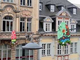 Bunt geschmückte Ostereier verzieren seit heute den Bereich zwischen Angerkreuz und alten Angerbrunnen. Wer den Blick nach oben richtet, wird sie oberhalb der Stadtbahn entdecken. Auf neun Eiern ist jeweils ein großer Buchstabe angebracht, die zusammen ein Wort ergeben.