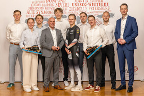 Im Rahmen der Verabschiedung der neun Athleten zum ISU Eisschnelllauf-Weltcup 2025/26 im Rathausfestsaal präsentierten die Eisschnellläufer um Hendrik Dombek, der mit dem Eissportclub Erfurt e.V. trainiert, auf dem Oberschenkel ihrer Rennanzüge den Aufdruck der Sportkampagne „Sport in Erfurt“.