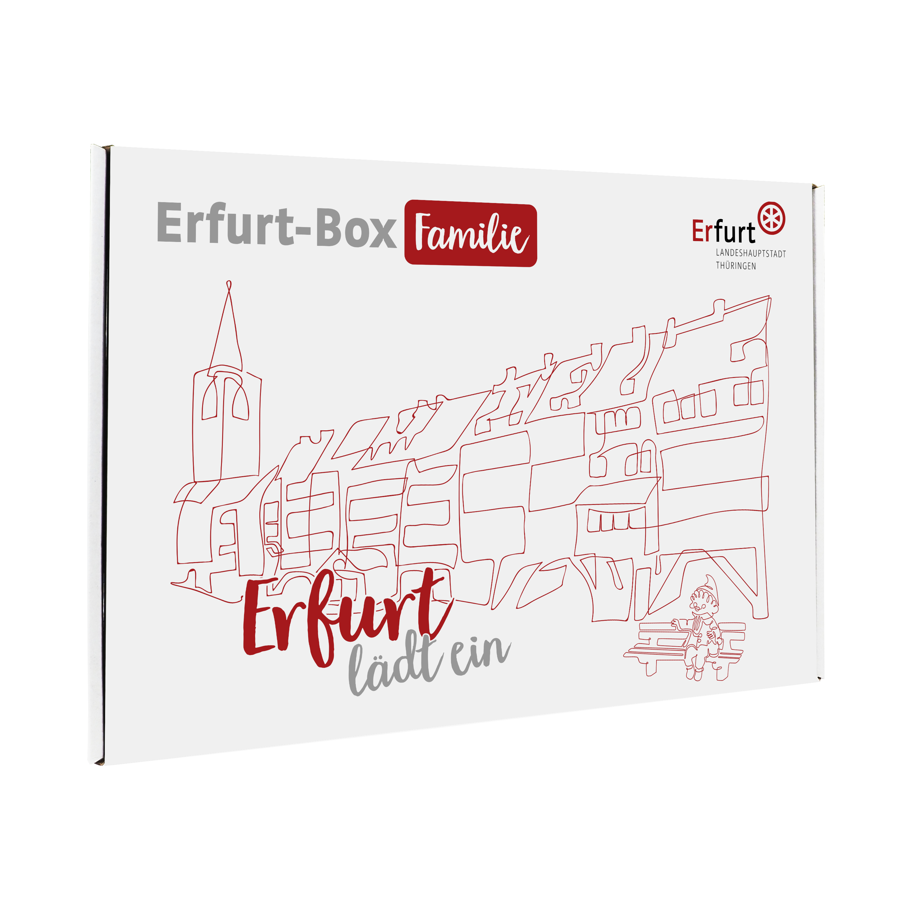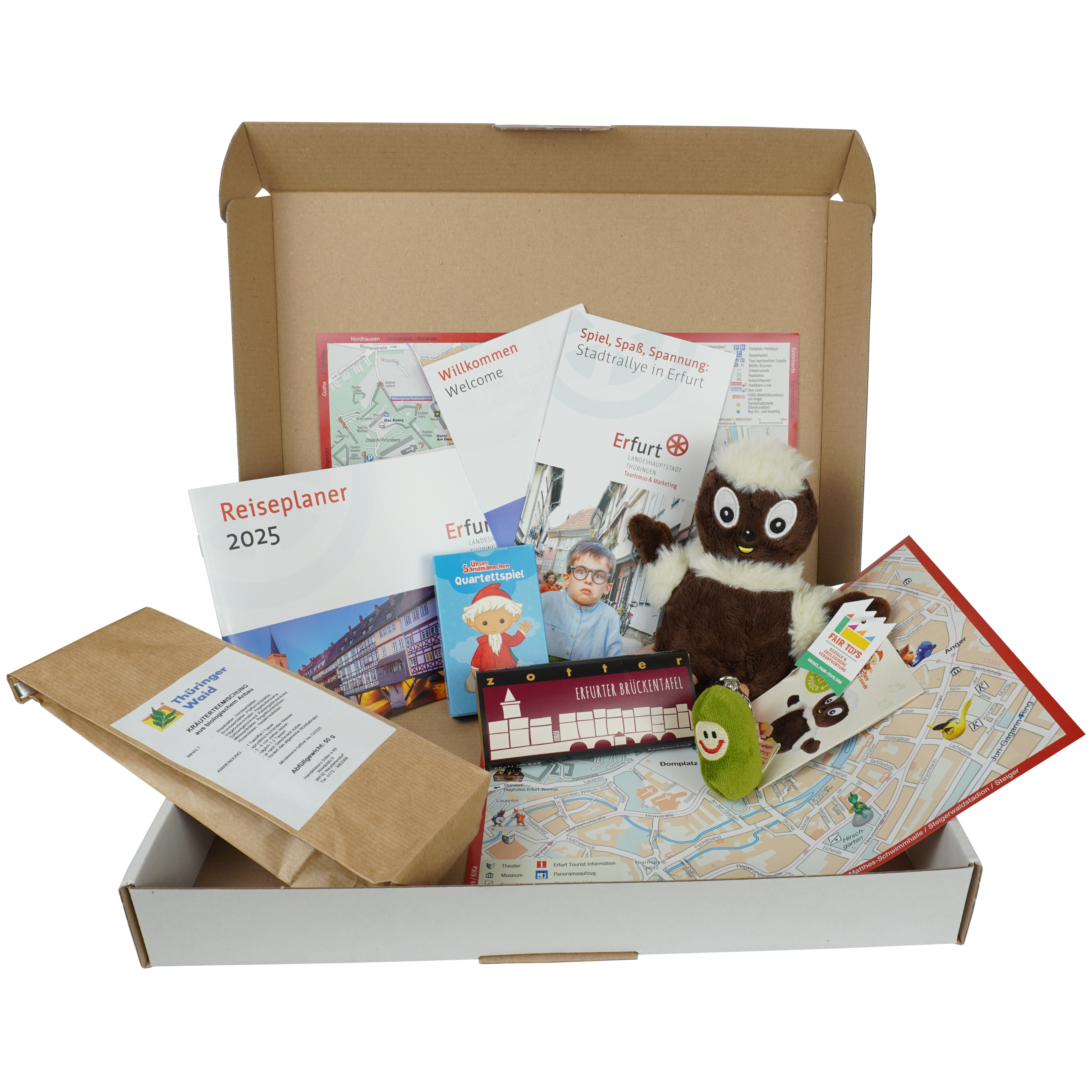 Die Erfurt-Box „Familie“ wurde speziell für Familien mit Kindern entwickelt und macht neugierig, die Stadt zu erkunden. Neben hilfreichen Informationen für Ihren Erfurt-Aufenthalt und zahlreichen Freizeit- und Ausflugstipps beinhaltet die Erfurt-Box „Familie“ auch kulinarische Genüsse aus der Thüringer Landeshauptstadt.