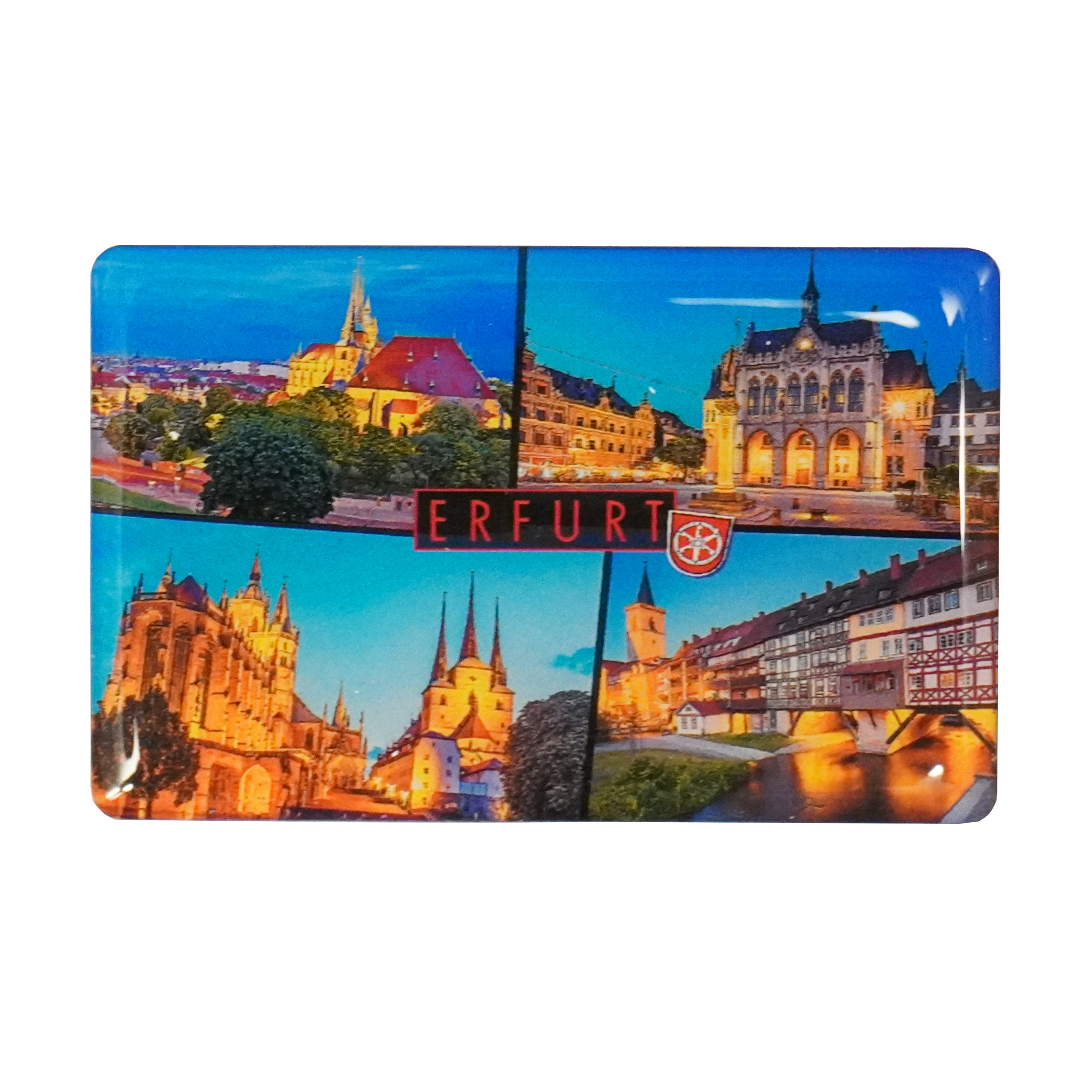 Der Flexi-Magnet zeigt eine Collage aus den vier Motiven Blick vom Petersberg auf den Dom, Rathaus, Dom St. Marien und St. Severi Kirche und die Krämerbrücke.