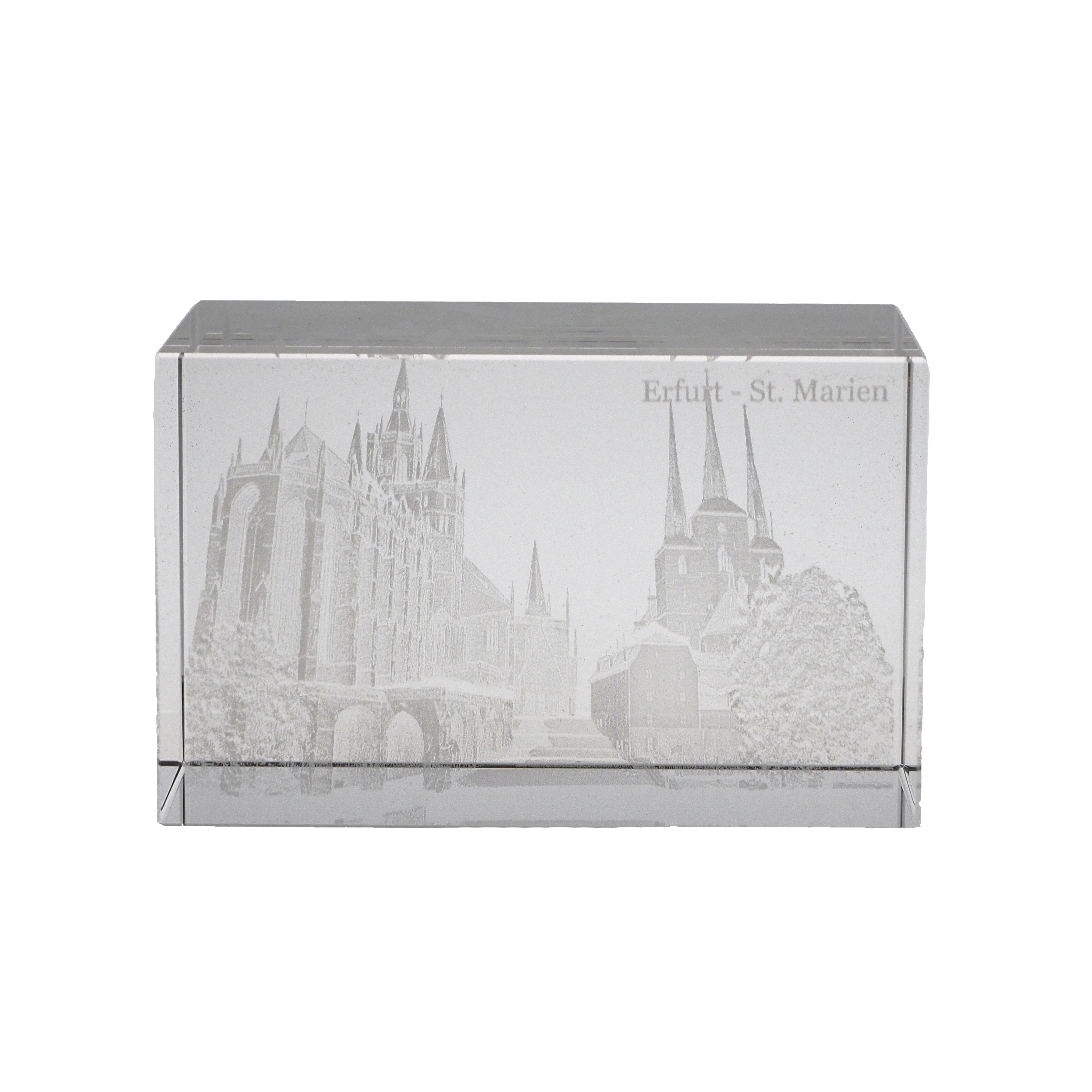Glasquader mit Gravur des architektonisch einzigartigen Ensembles Dom St. Marien und der St. Severi Kirche.