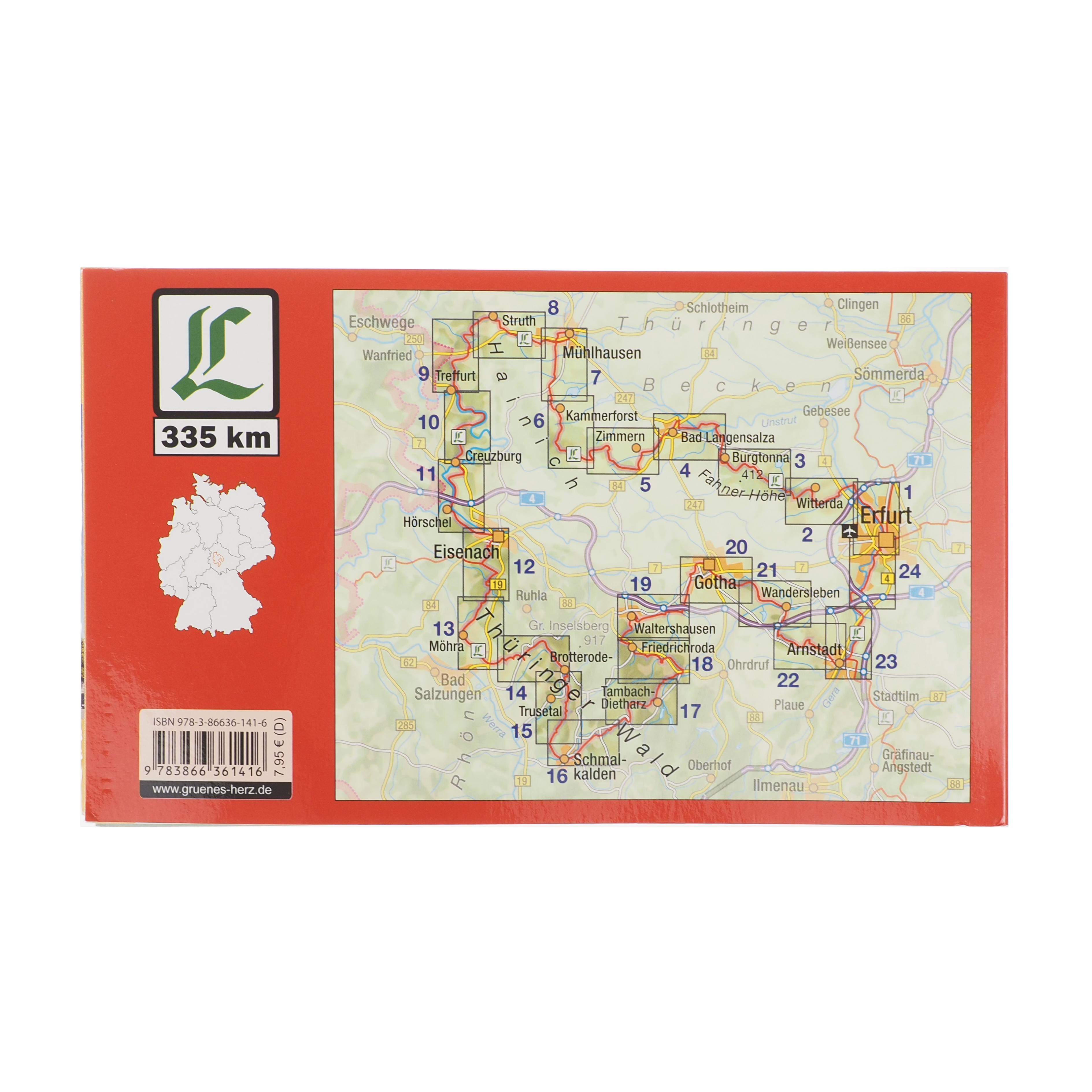 Die spiralgebundene Broschüre Lutherweg, Westschlaufe folgt dem westlichen Teil. Beginn und Ende für die 335 Km lange Route ist in Erfurt. Die Strecke folgt den Städten Bad Langensalza, Mühlhausen, Eisenach, Schmalkalden, Gotha, Arnstadt. Die Broschüre ist mit Kartenblättern, im Maßstab 1:50.000 ausgestattet. Den Lutherweg hebt eine rote Linie hervor. Jedem Kartenblatt ist eine Textseite gegenüber gestellt. Auf ihr findet der Nutzer Hintergrundwissen zu Luthers Aufenthalten, Lutherzitate zum Ort und touristische Informationen der Gegenwart.