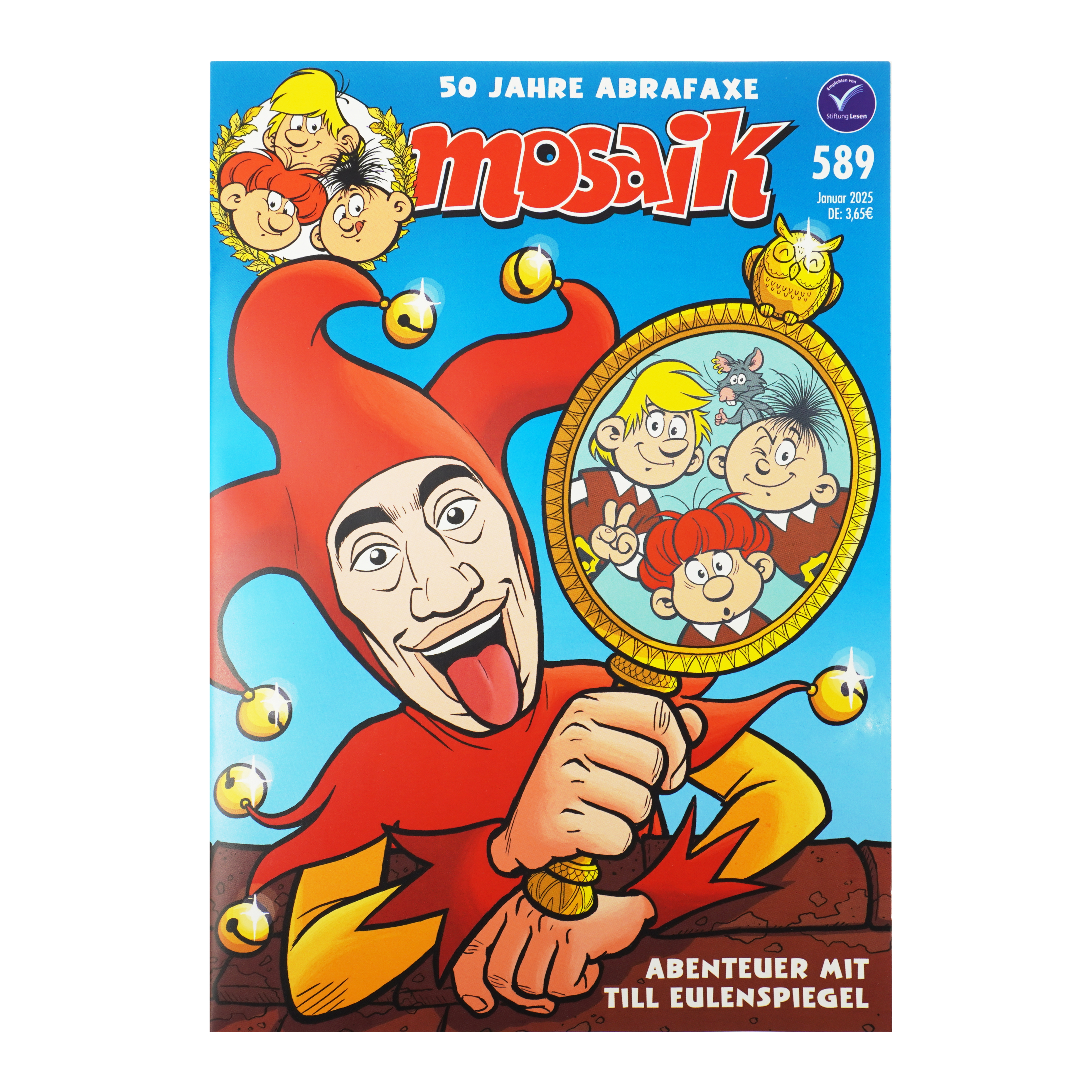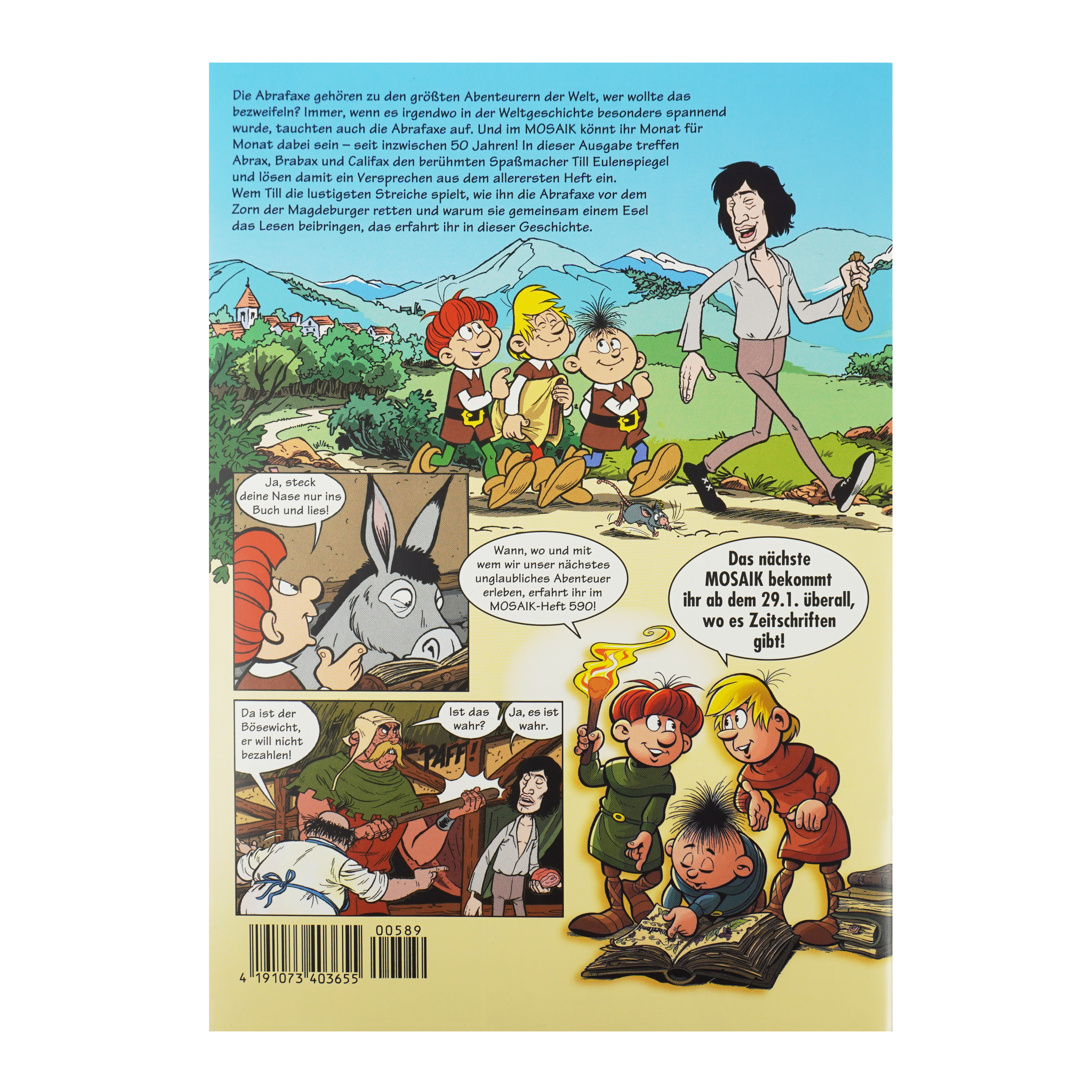 In dieser Ausgabe treffen Abrax, Brabax und Califax den berühmten Spaßmacher Till Eulenspiegel und lösen damit ein Versprechen aus dem allerersten Heft ein. Wem Till die lustigsten Streiche spielt, wie ihn die Abrafaxe vor dem Zorn der Magdeburger retten und warum sie gemeinsam einem Esel das Lesen beibringen, das erfahrt ihr in diesem MOSAIK.