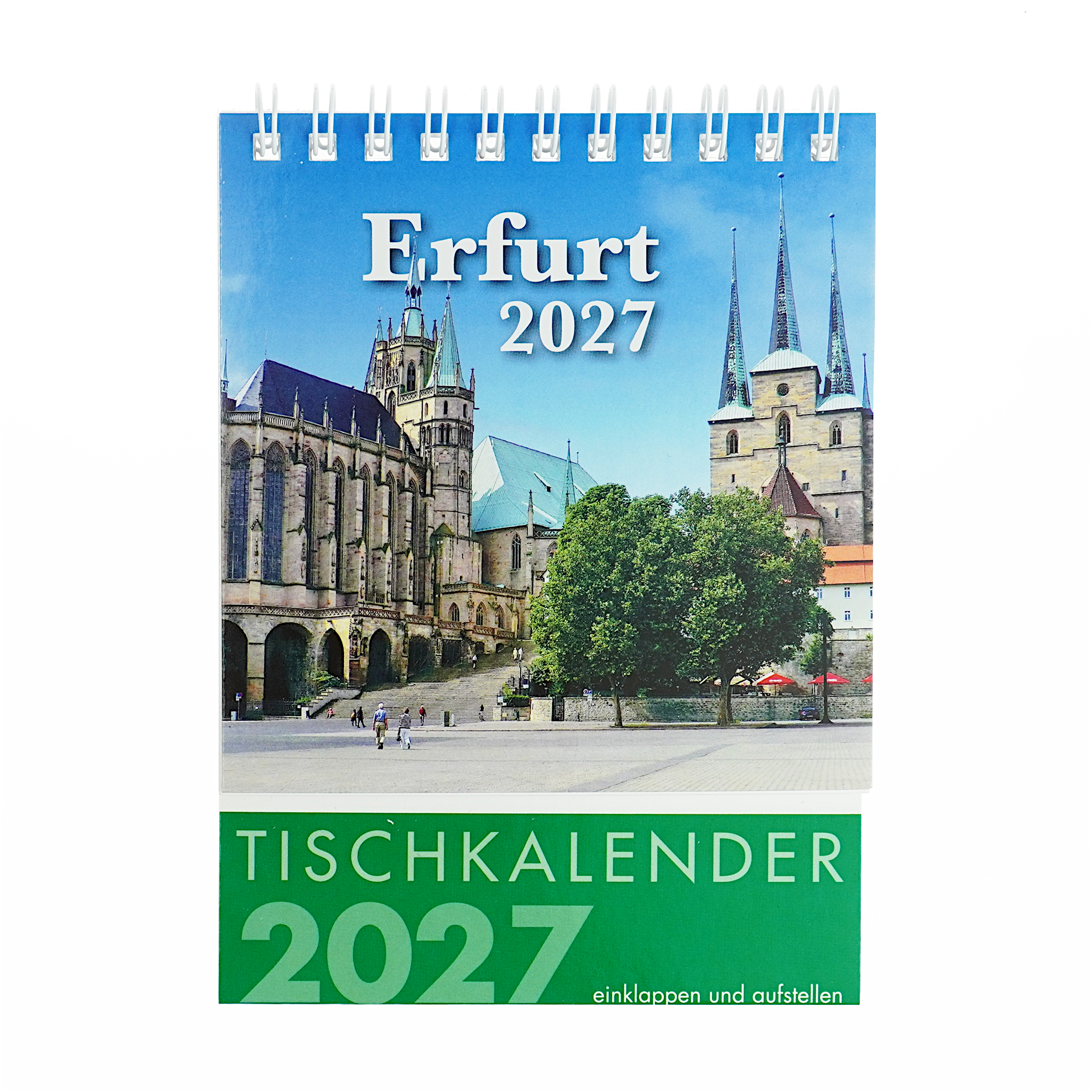 Der Tischkalender 2027 präsentiert jeden Monat ein Hightlight der Landeshauptstadt wie beispielsweise die Krämerbrücke, das Rathaus oder den Domplatz. Einfach einklappen und aufstellen.