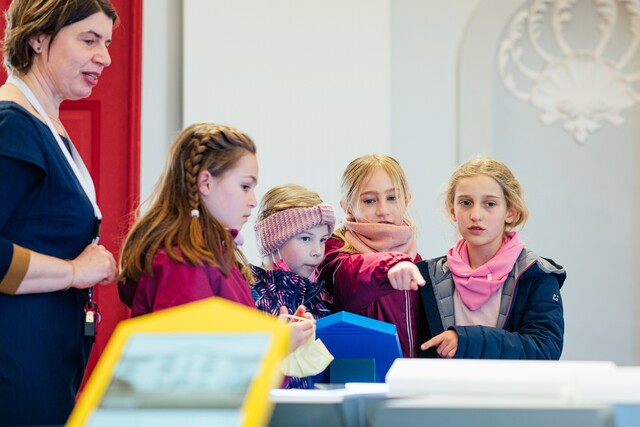 Die Kinder erkunden ausgewählte Orte auf dem Petersberg und beschäftigen sich mit der Festungsgeschichte. Gemeinsam erbauen sie in der Ausstellung virtuell eine Festung.