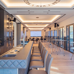 Modernste Audio- und Videotechnik sorgen für besten Sound und brillante Bilder. Auf einer LCD-Videowall von 3,60 m x 2,00 m lassen sich Präsentationen, Bilder, Webinhalte, Videos und Livestreams in FullHD darstellen. Ein BOSE-Soundsystem sorgt für hervorragenden Klang in allen Räumen. Eine zentrale AV-Steuerung ermöglicht die unabhängige Akustik von Terrasse, Event- und Barbereich. Auch die Lichtstimmung lässt sich in jedem Bereich individuell auf die Tageszeit und den Beleuchtungszweck raumspezifisch einstellen.