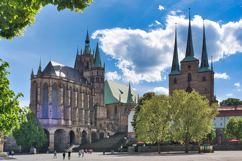 Über eine 70-stufige Freitreppe gelangt man vom Domplatz auf den Domberg mit seinen beiden ehemaligen Stiftskirchen. Der Dom mit hochgotischem Chor, romanischem Turmbereich und spätgotischer Westhalle ist Nachfolger des 724 von Rom veranlassten Sakralbaus. Er war die Hauptkirche des 742 von Bischof Bonifatius gegründeten Bistums Erfurt. Im Innenraum sind die gotischen Chorfenster, das umfängliche Chorgestühl (14. Jhd.) sowie die romanischen Skulpturen einer thronenden Madonna und eines monumentalen Kerzenträgers besonders sehenswert. Im mittleren Turm befindet sich die weltweit größte mittelalterliche freischwingende Glocke, die "Gloriosa".